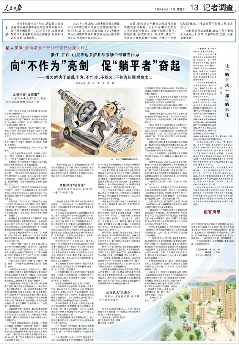 4月10日,《人民日报》整版刊发文章《向“不作为”亮剑促“躺平者”奋起》《让“躺平式干部”躺不住》。全文如下:引子